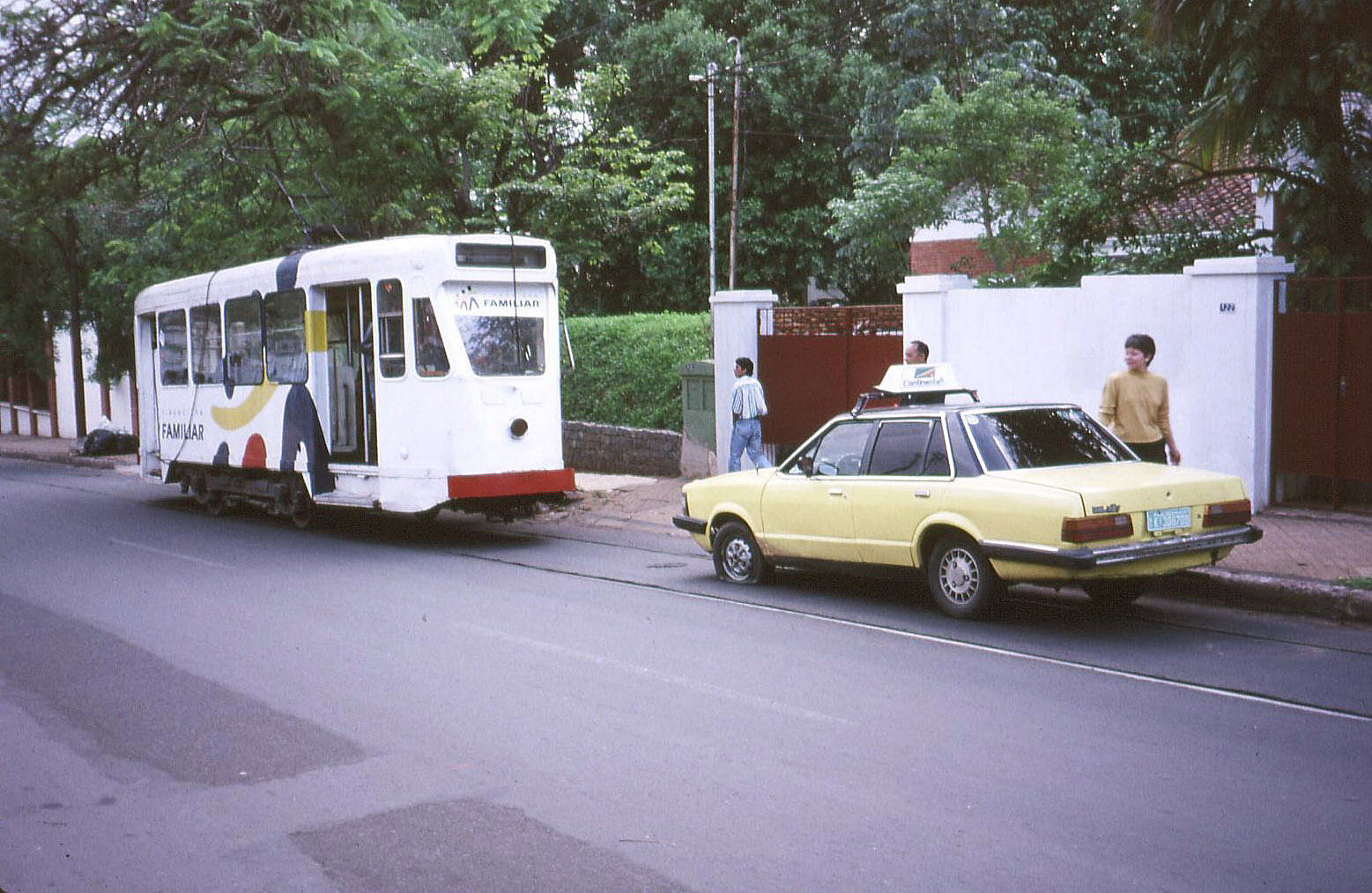 stopped by a taxi parked across the tracks with a flat tire. The